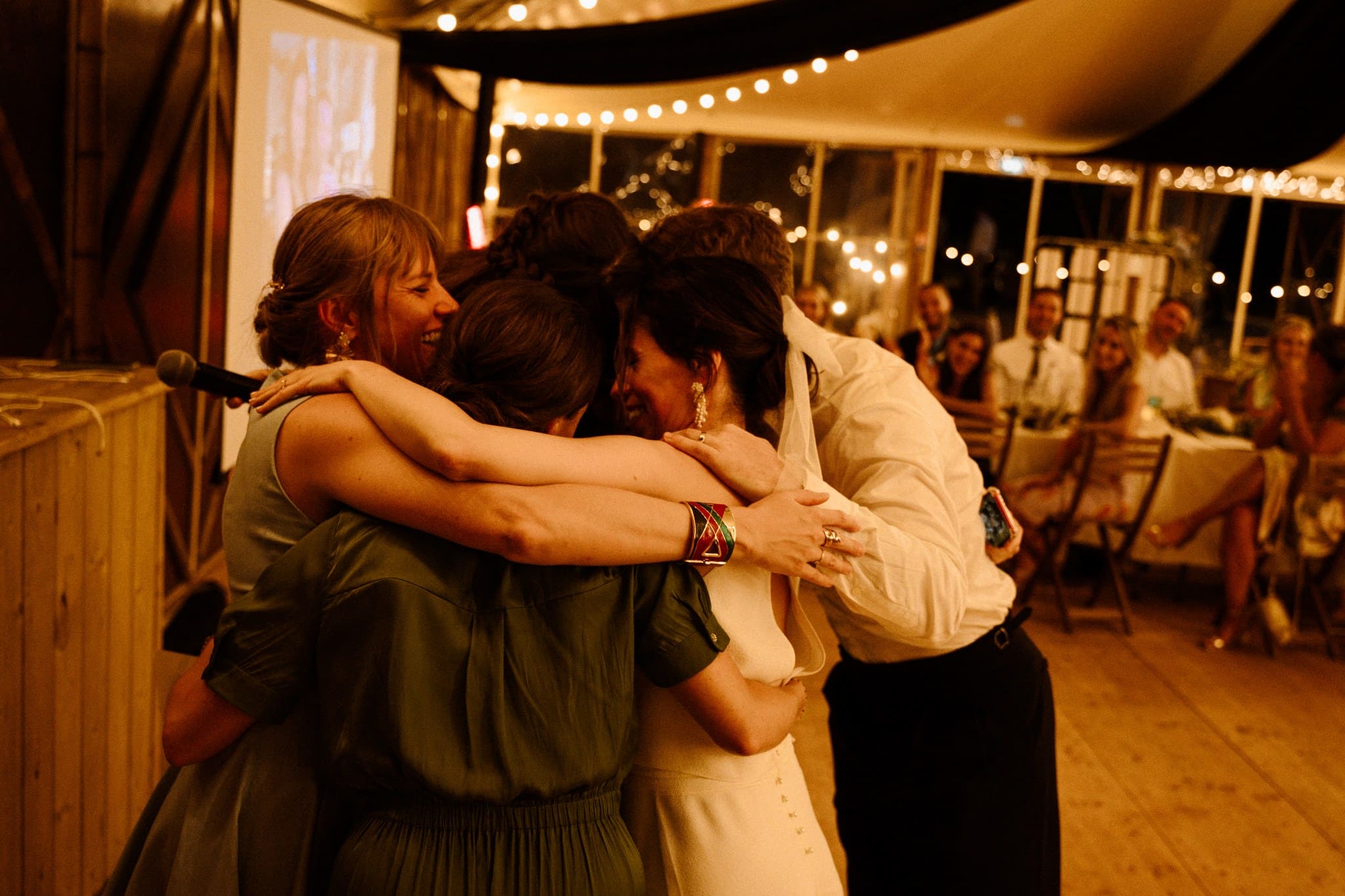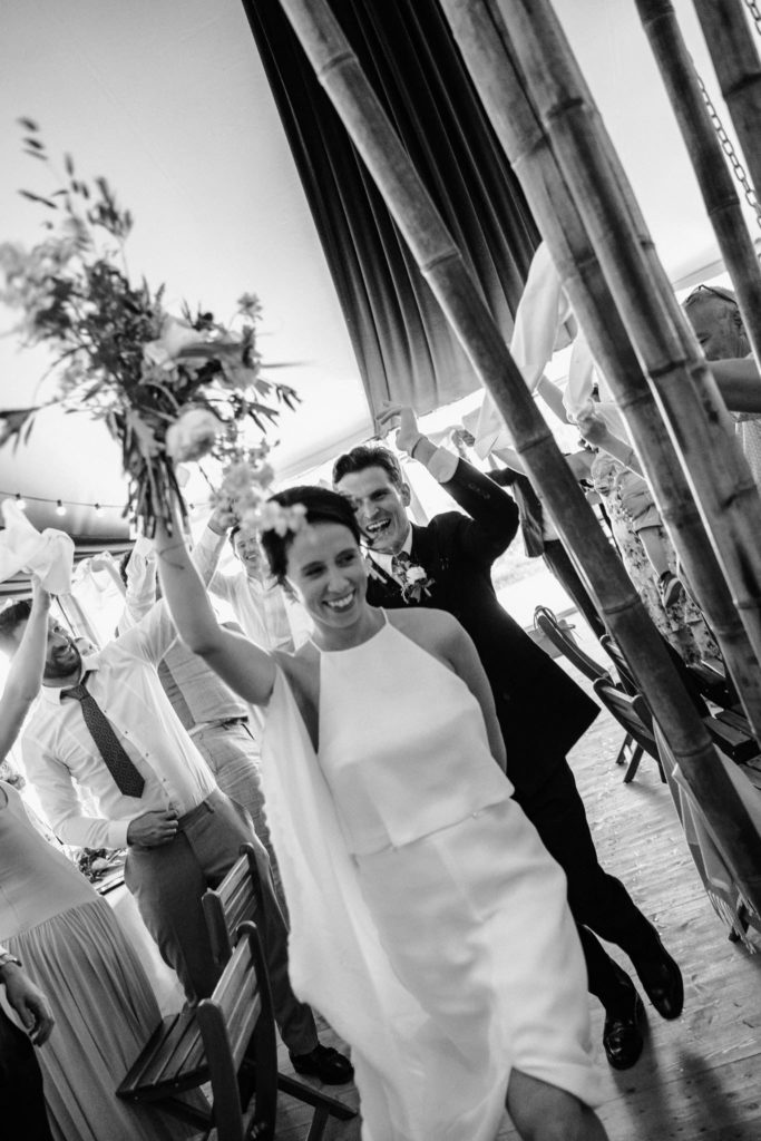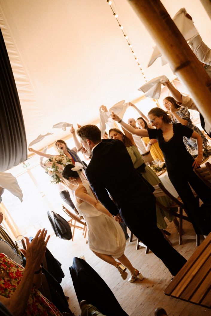 Nous avons dû finalement les libérer pour qu’ils puissent retrouver leurs invités. Pour leur entrée de salle, les voilà en train de danser et de courir autour des tables, les invités tous debout à agiter leurs serviettes. Le ton était donné : la soirée sera festive !