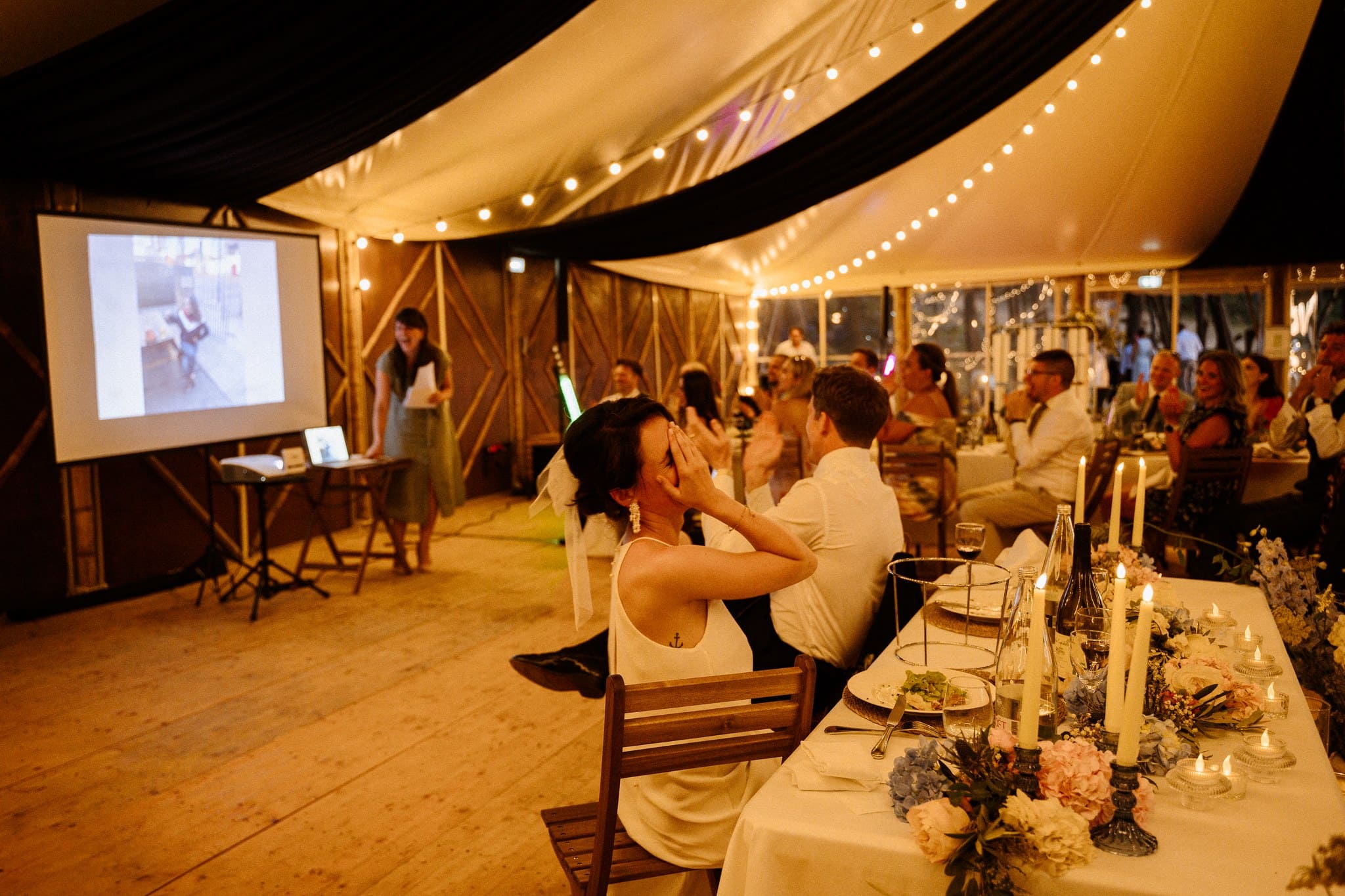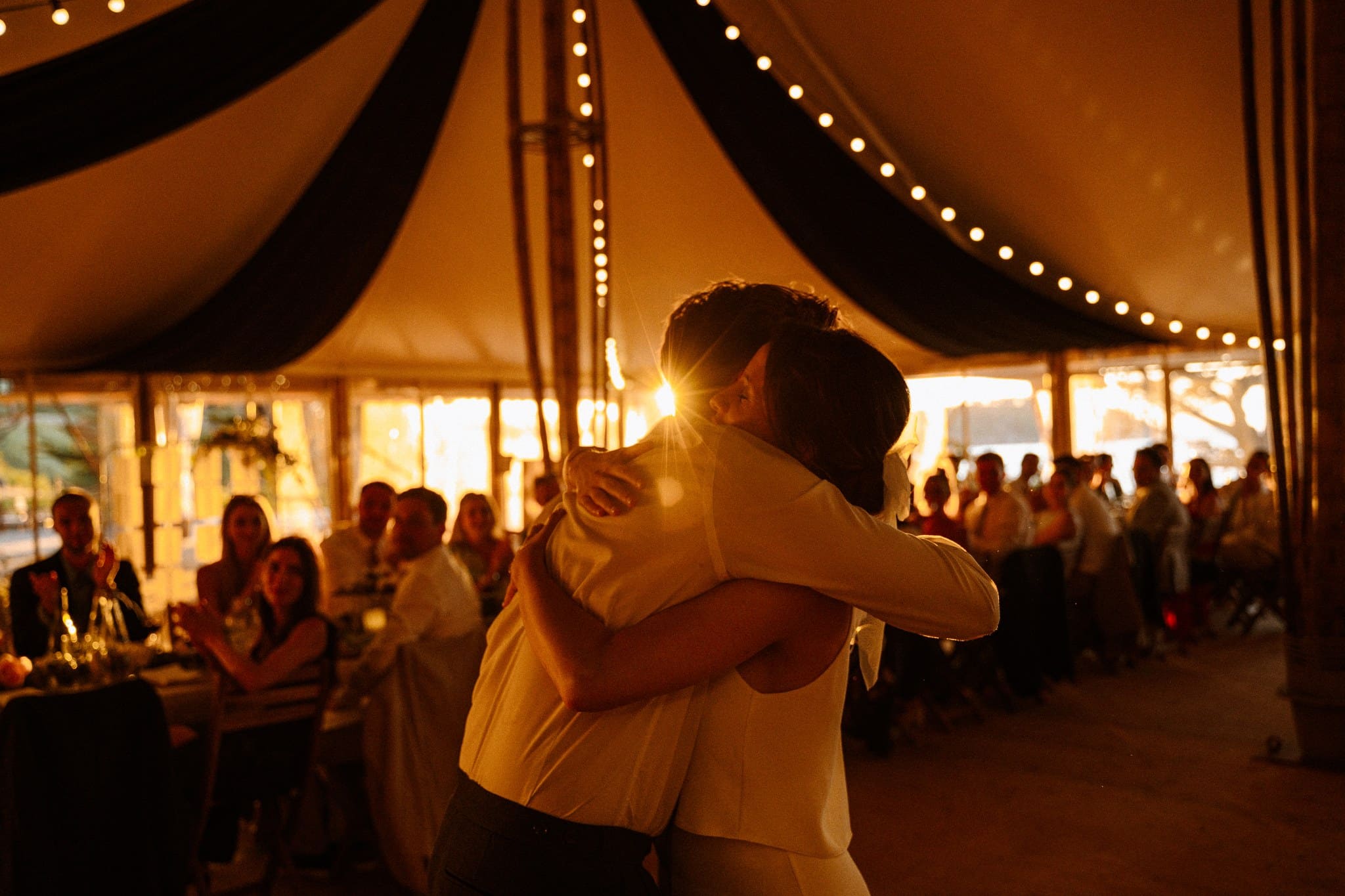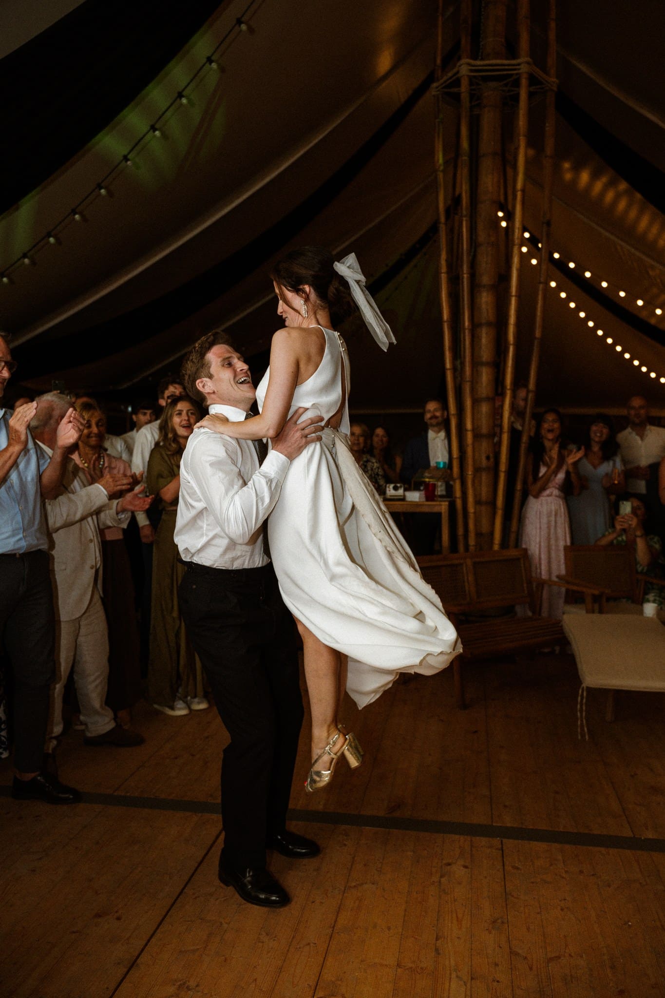 Nous avons dû finalement les libérer pour qu’ils puissent retrouver leurs invités. Pour leur entrée de salle, les voilà en train de danser et de courir autour des tables, les invités tous debout à agiter leurs serviettes. Le ton était donné : la soirée sera festive !
