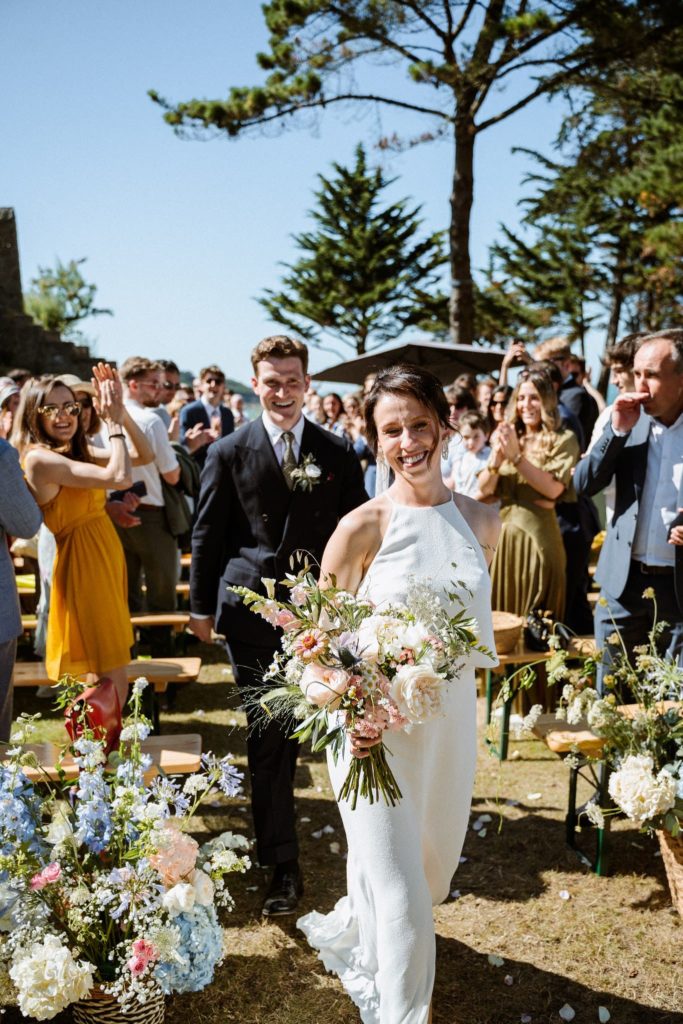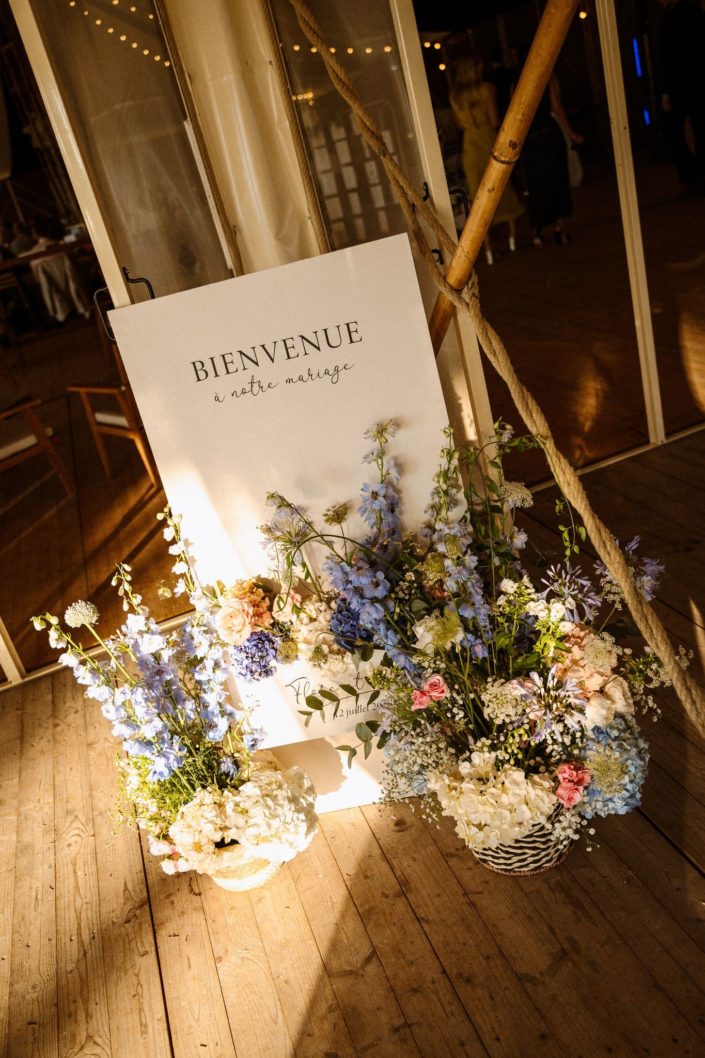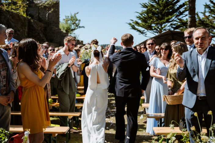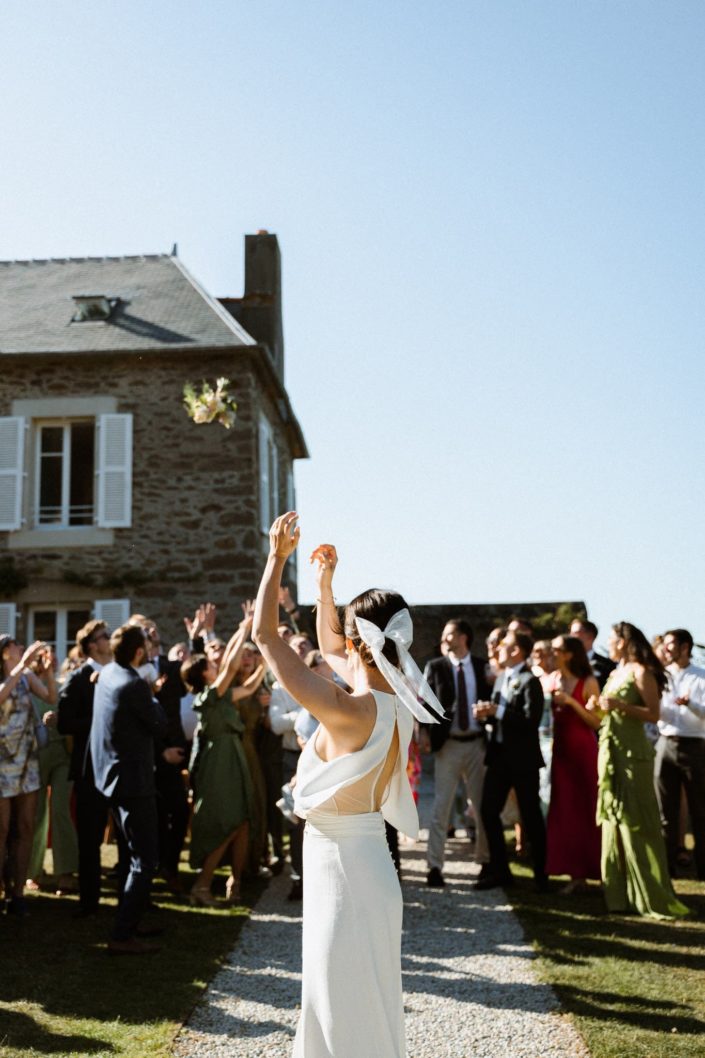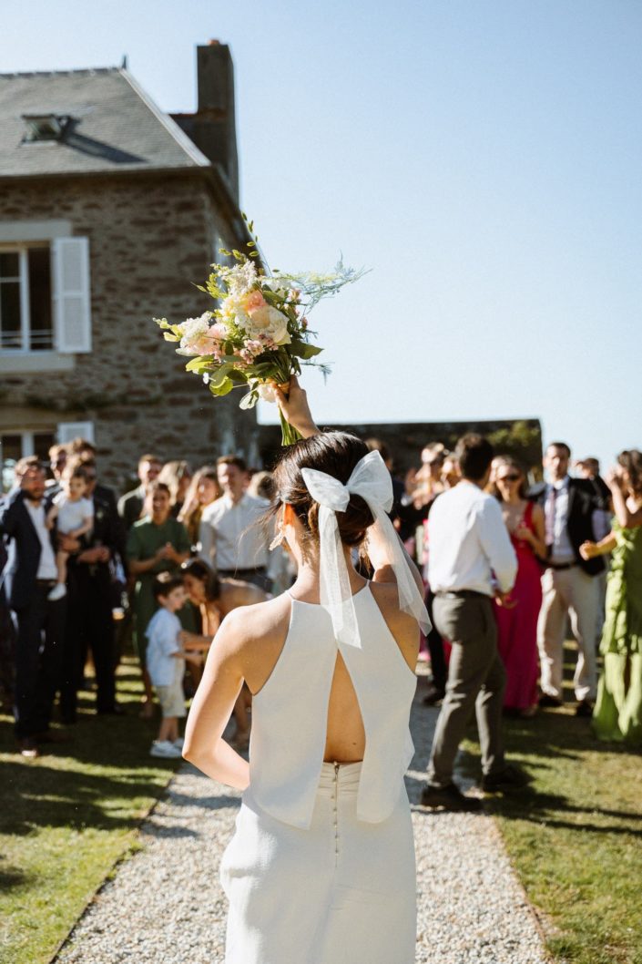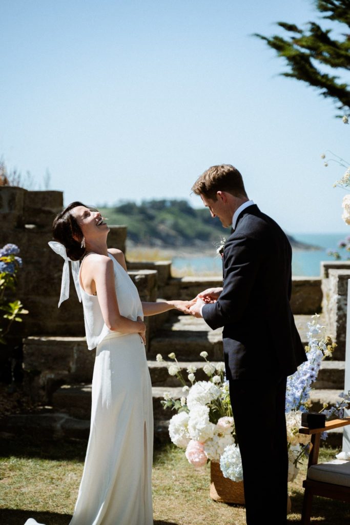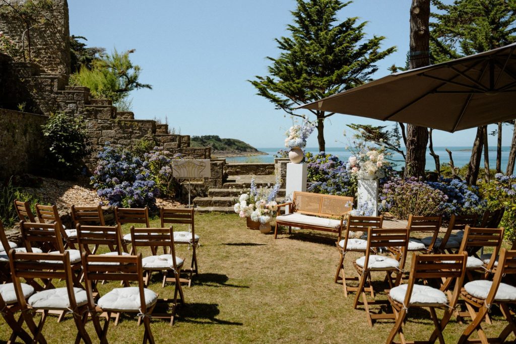 Des années plus tard, après être partie vivre en Angleterre où elle a rencontré Jack, celui-ci la demandait en mariage. Flore a donc commencé à se renseigner sur les domaines en Bretagne. C’était important pour elle de se marier ici. Quand elle s’est rendu compte que la bâtisse qu’elle observait petite était devenue un lieu de mariage, l’évidence s’est imposée : célébrer leur mariage franco-anglais à Saint-Malo, dans ce lieu chargé de souvenirs. Dire “oui” face à la mer, là où tout a commencé.