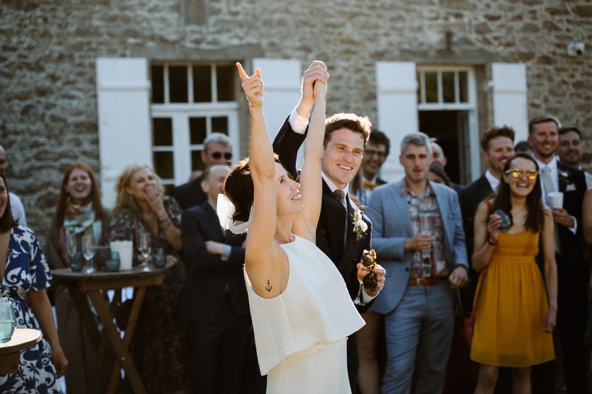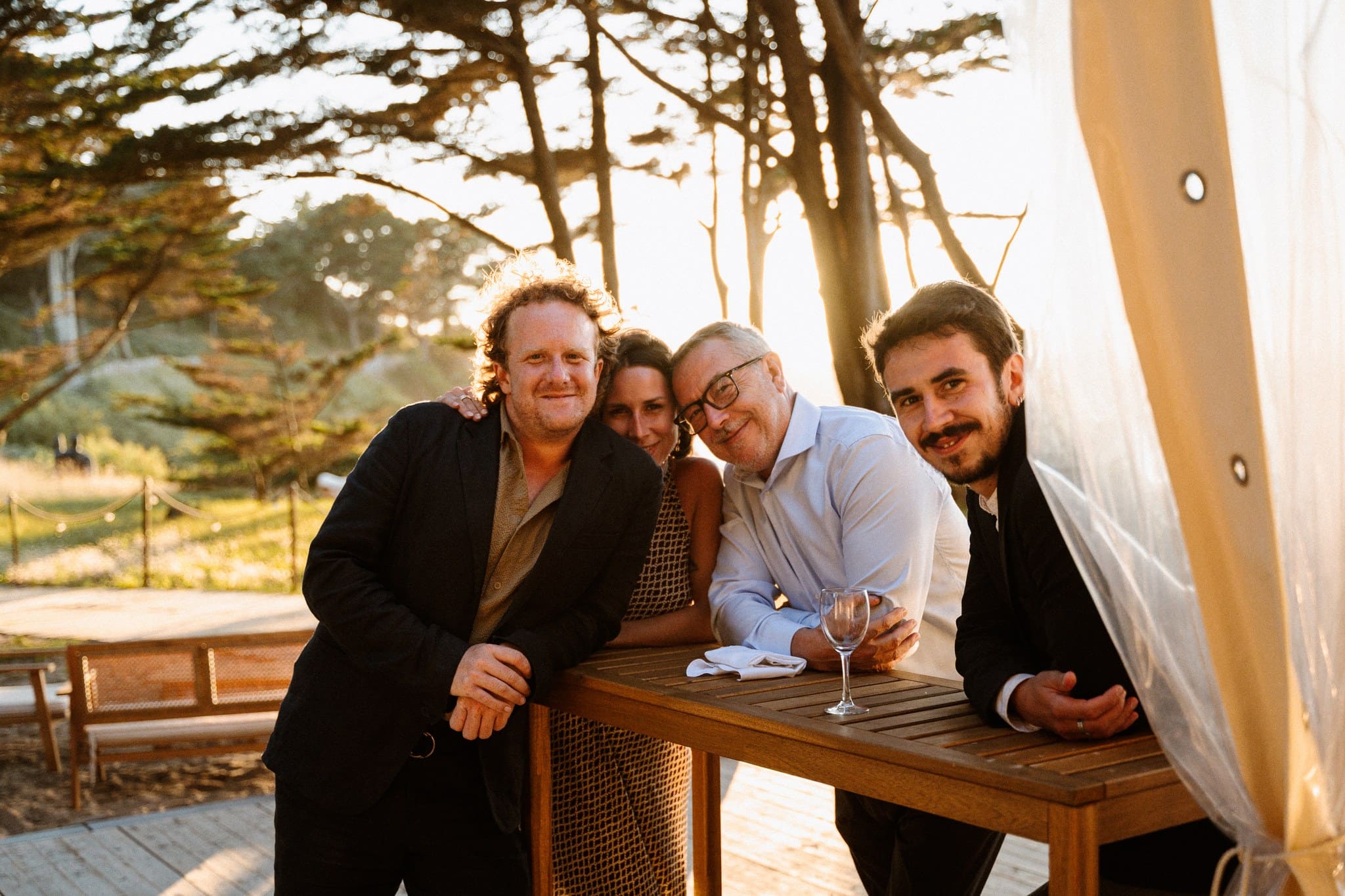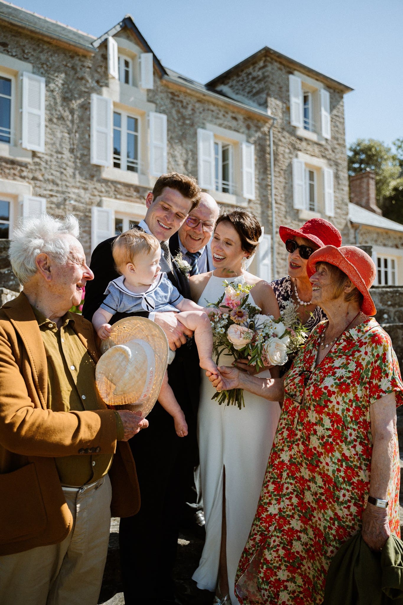 La cérémonie laïque est terminée, il est presque temps pour nos mariés de savourer ce cadre idyllique, les douceurs du traiteur et les premières bulles. Mais avant ça, les mariés souhaitaient tout de même quelques photos de groupe. Nous avons choisi un endroit dos au soleil pour que les invités ne subissent pas trop sa chaleur, qu’ils puissent ouvrir les yeux et surtout passer un bon moment. Cela nous tient à cœur que les photos de groupe soient dynamiques et vivantes.
