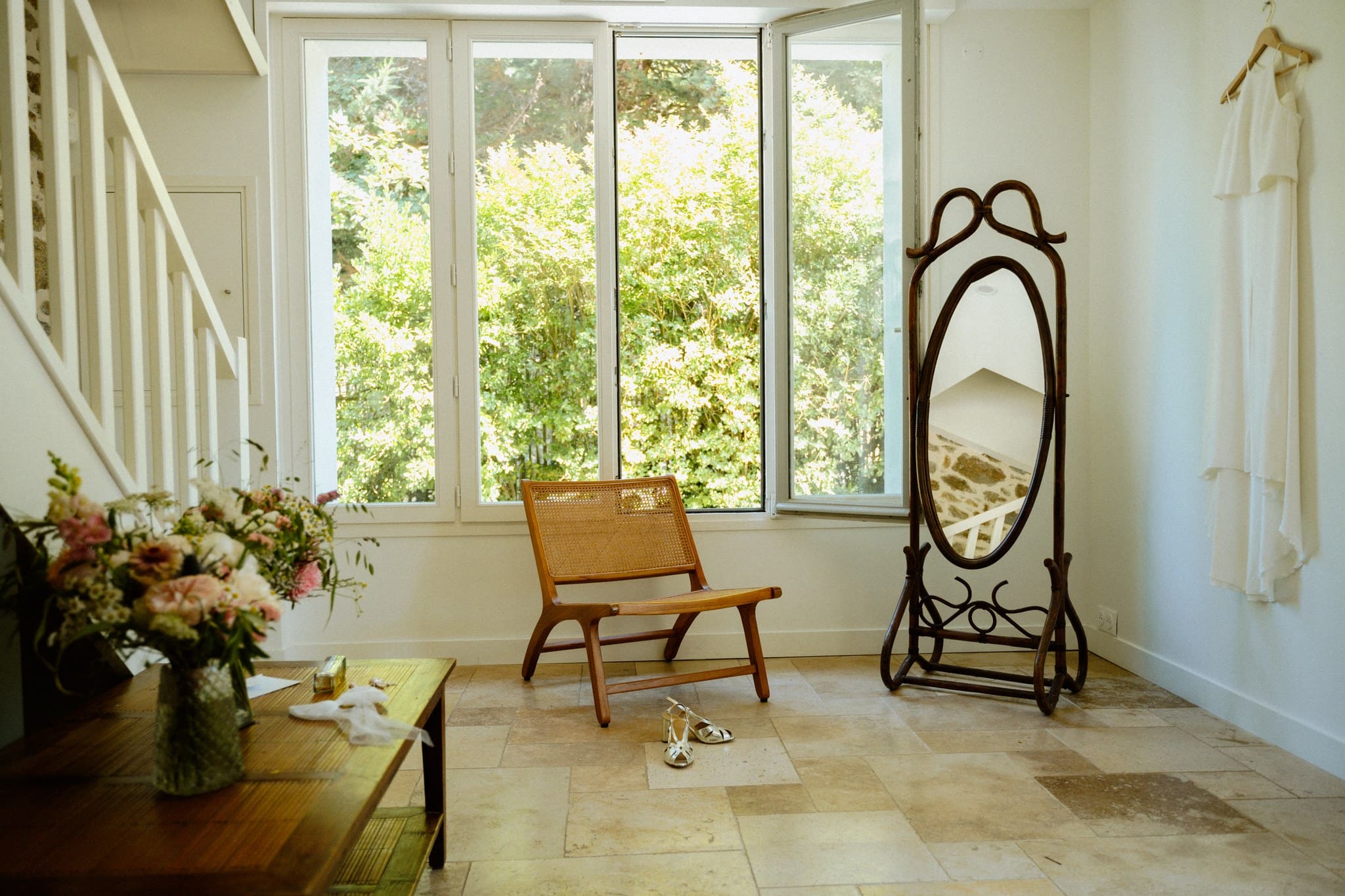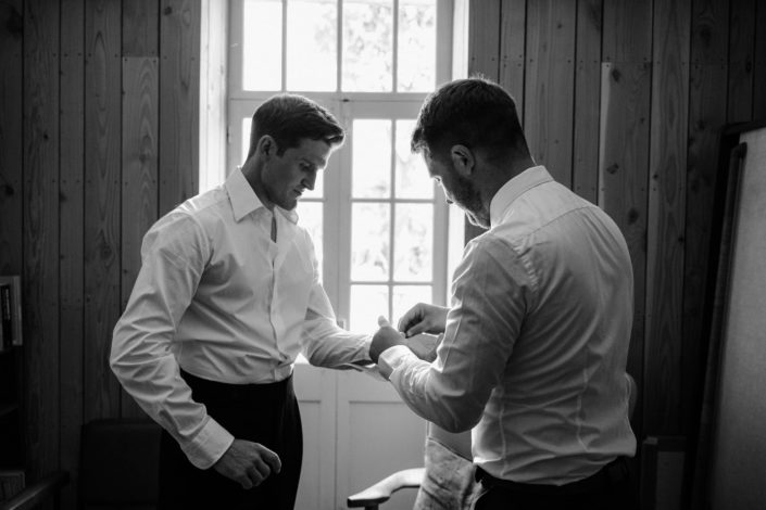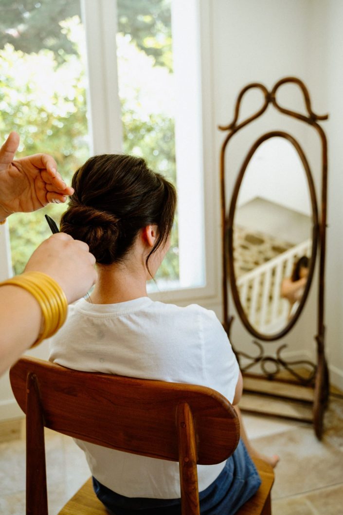Viens alors le jour J. Grâce au repérage la veille, nous savions directement où rejoindre nos futurs mariés pour leur préparatifs. Nous avons commencé par aller dire bonjour à Flore et à sa dream team qui était en train de se faire coiffer. Ce n’est pas forcément un moment que l’on immortalise en détail, mais plus un moment où nous discutons avec les proches pour qu’au fil de la journée, ils deviennent de plus en plus à l’aise avec nous. Nous prenons uniquement les dernières touches de maquillage, la dernière mèche de cheveux à ajuster ou le dernier coup de laque, ce qui est largement suffisant pour nos reportages photo et vidéo.