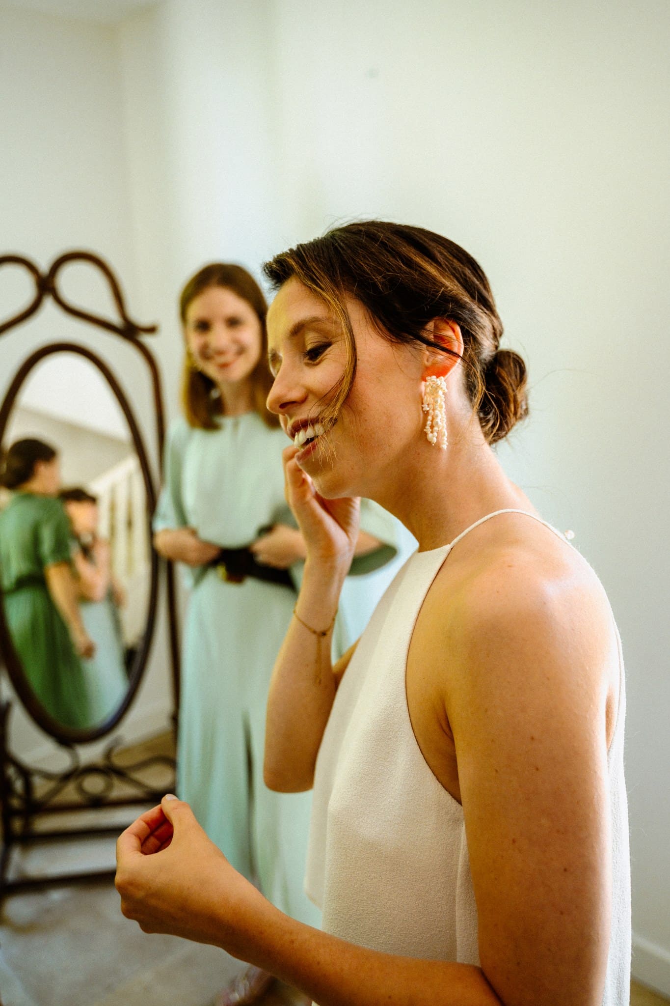 Une fois terminé, nous sommes retournés voir Flore pour son habillage cette fois-ci. C’est indispensable pour nous d’avoir l’ensemble des préparatifs des deux mariés. Nous avons mis de la musique et c’était parti pour un moment hyper convivial entre fille (+ Tom haha)