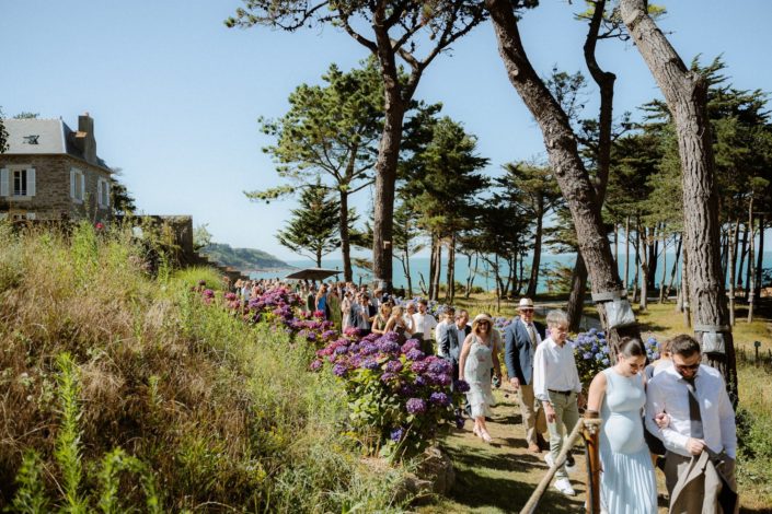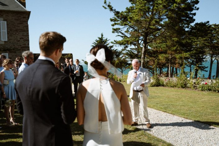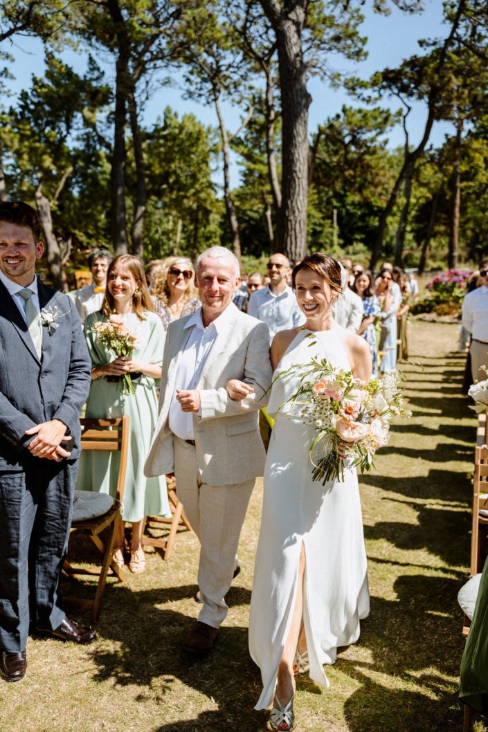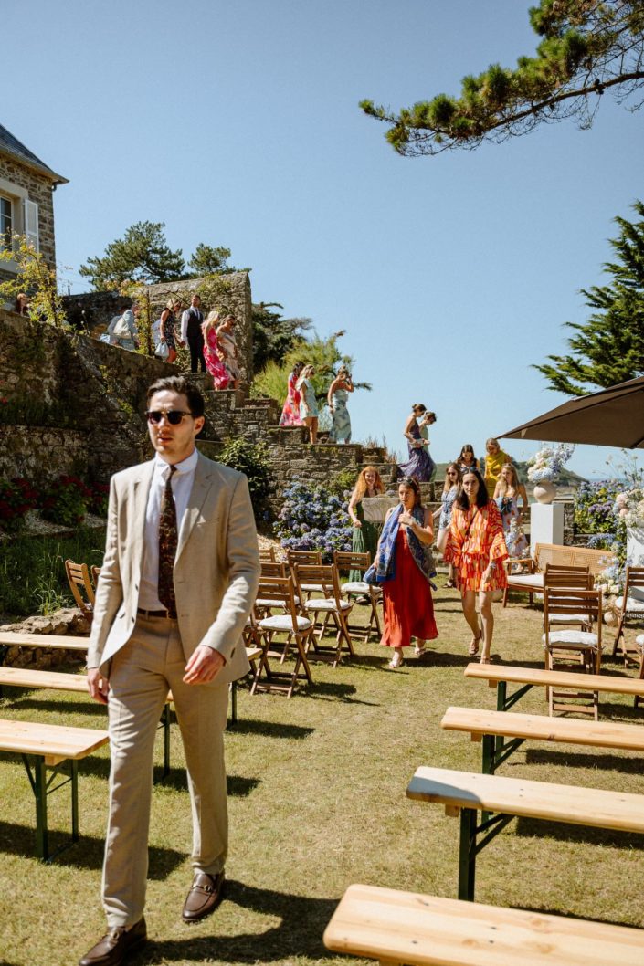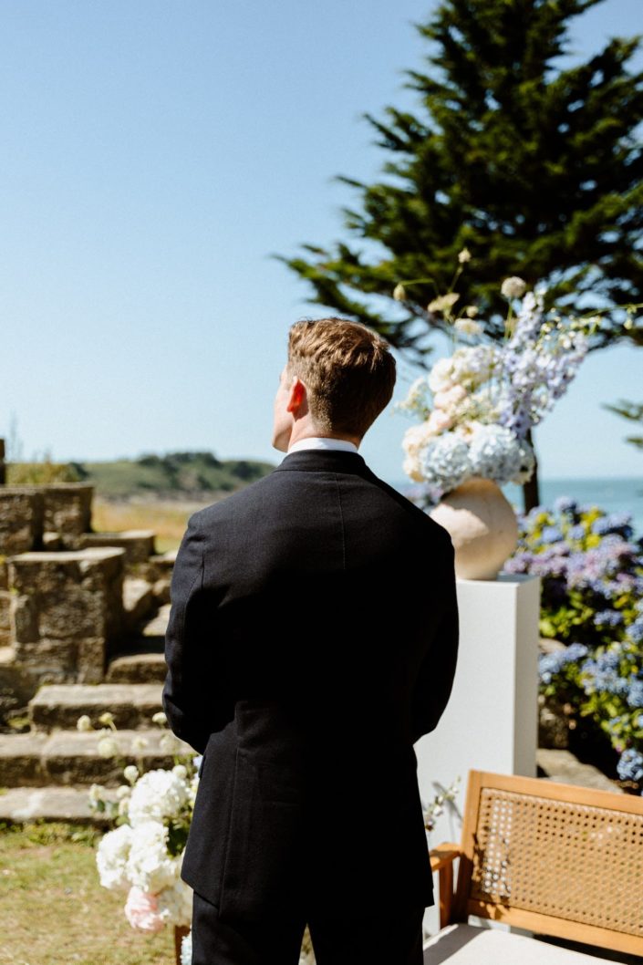 Les invités ont commencé à arriver et à s’installer. On sentait cette impatience montée, cette envie de vivre ce moment. L’officiante est arrivée, Jack s’est alors positionné dos à l’assemblée, face à la mer et nous attendions tous Flore, notre mariée. La découverte ou le first look est toujours un des moments clés du mariage. L’émotion est souvent palpable. Ça n’a pas loupé. Jack était ému, comme nous tous.