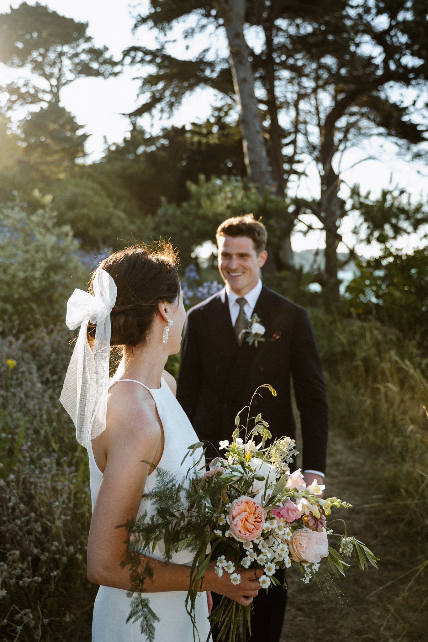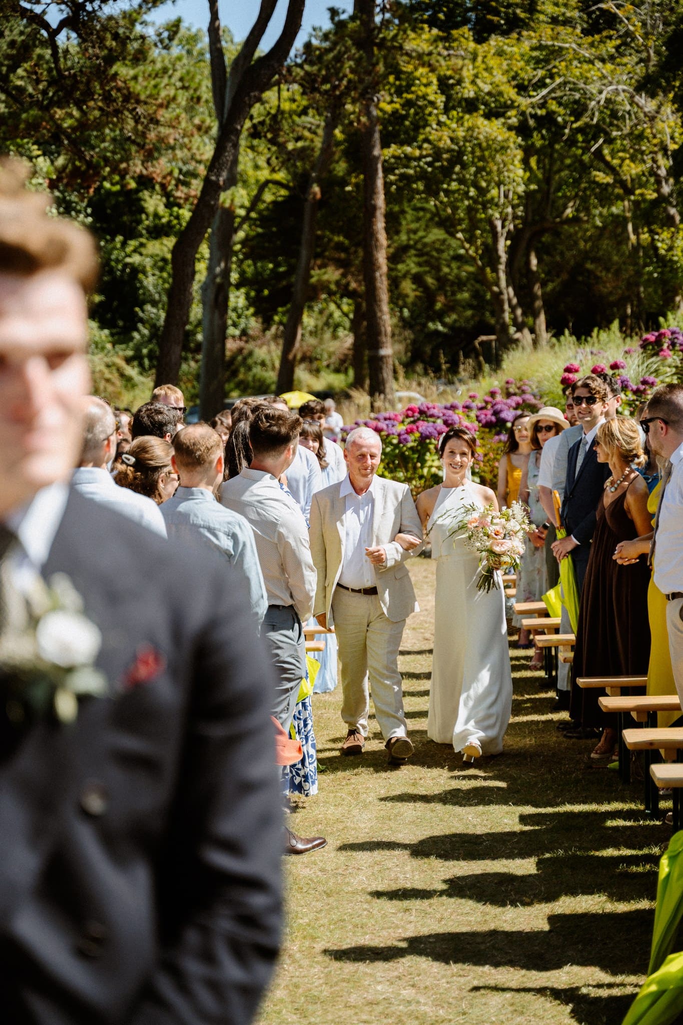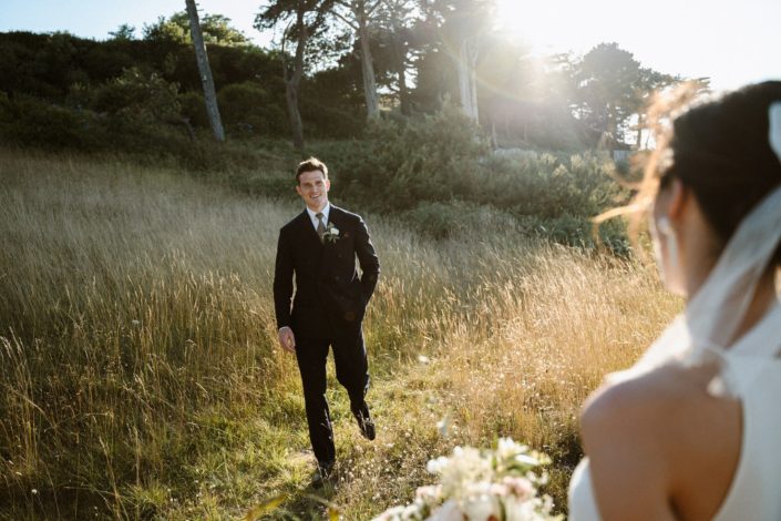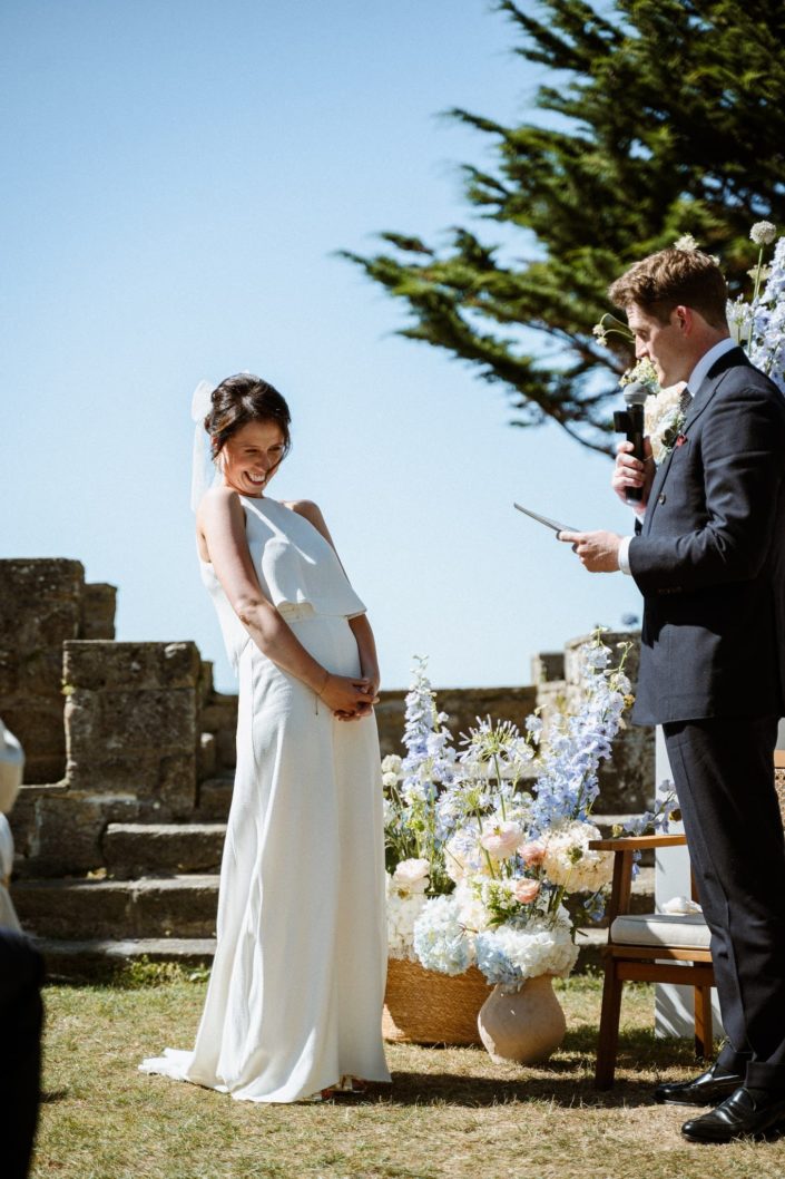 Les invités ont commencé à arriver et à s’installer. On sentait cette impatience montée, cette envie de vivre ce moment. L’officiante est arrivée, Jack s’est alors positionné dos à l’assemblée, face à la mer et nous attendions tous Flore, notre mariée. La découverte ou le first look est toujours un des moments clés du mariage. L’émotion est souvent palpable. Ça n’a pas loupé. Jack était ému, comme nous tous.