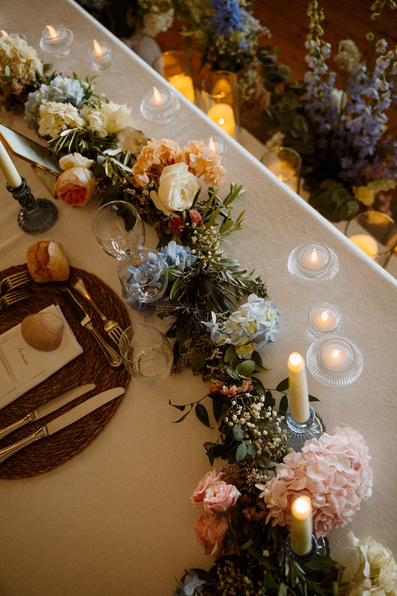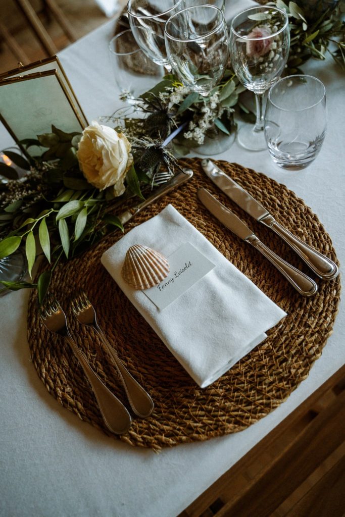 De notre côté, on profite aussi du vin d’honneur pour aller immortaliser la salle de réception et sa décoration. On en parle de cette vue face à la mer ? Cette salle nous rappelle où nous sommes et que les côtes bretonnes sont sublimes. Les petits coquillages et les huîtres avec leurs perles rappellent également ce côté iodé que l’on se devait d’immortaliser.