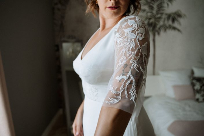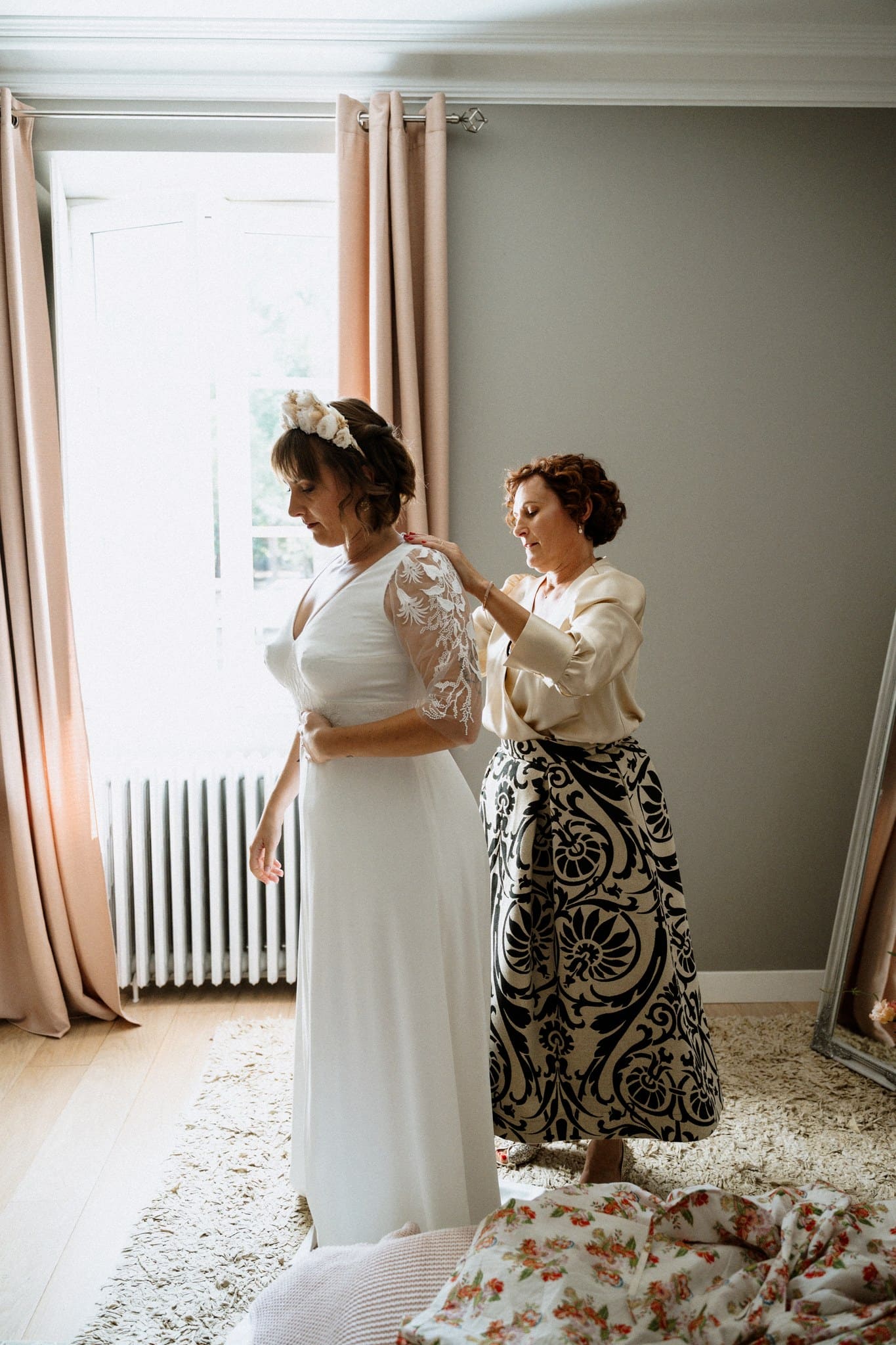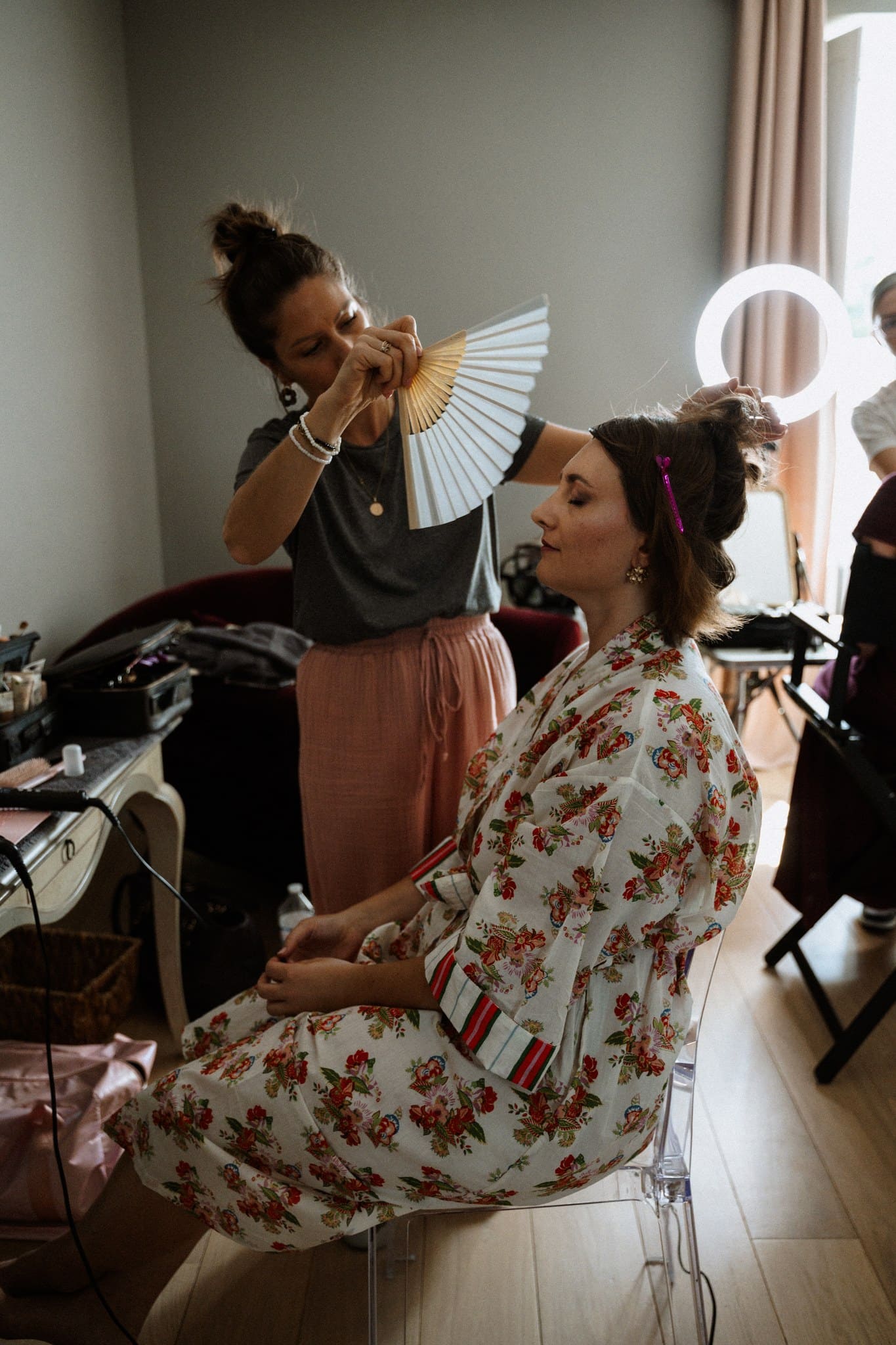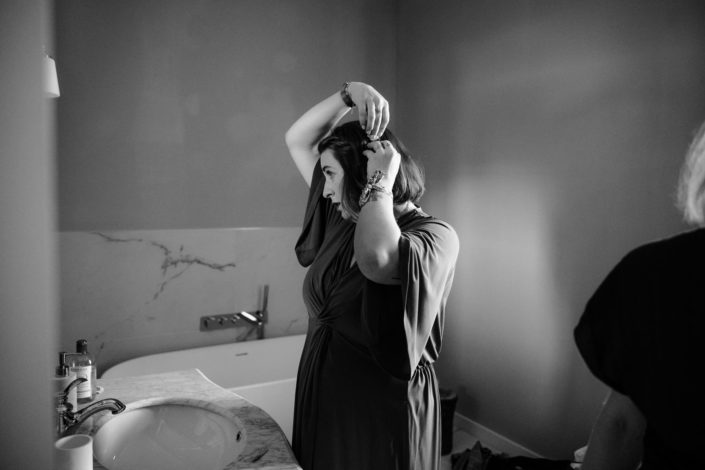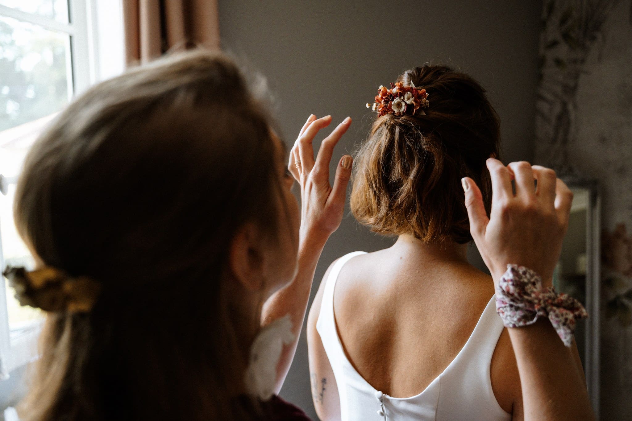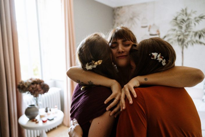 Il y aurait donc deux moments de préparation le jour J, avec deux robes de mariée différentes. Pour le premier, Mathilde souhaitait être entourée de sa team d’honneur ; pour le second, elle voulait partager ce moment avec sa maman.