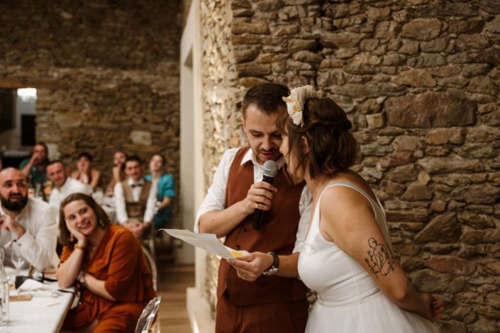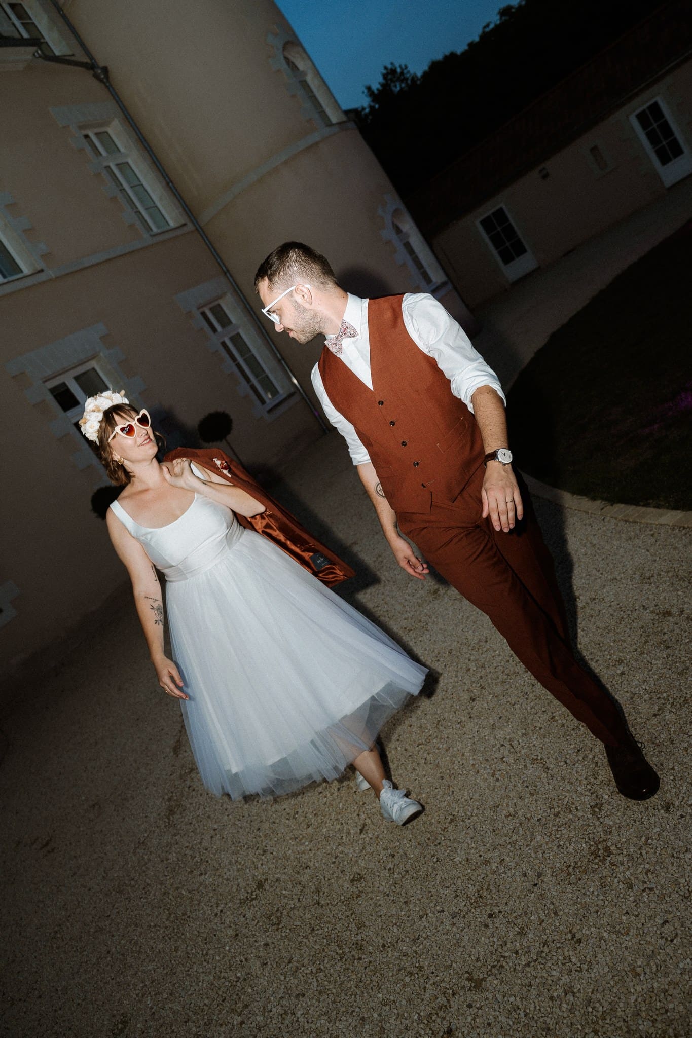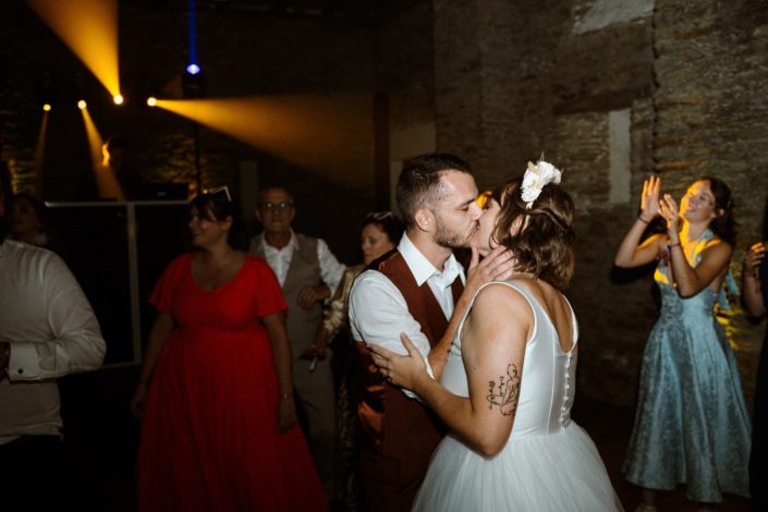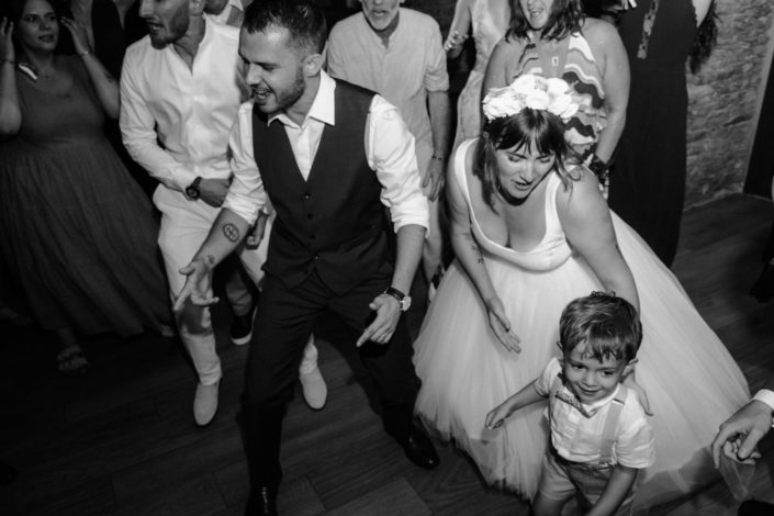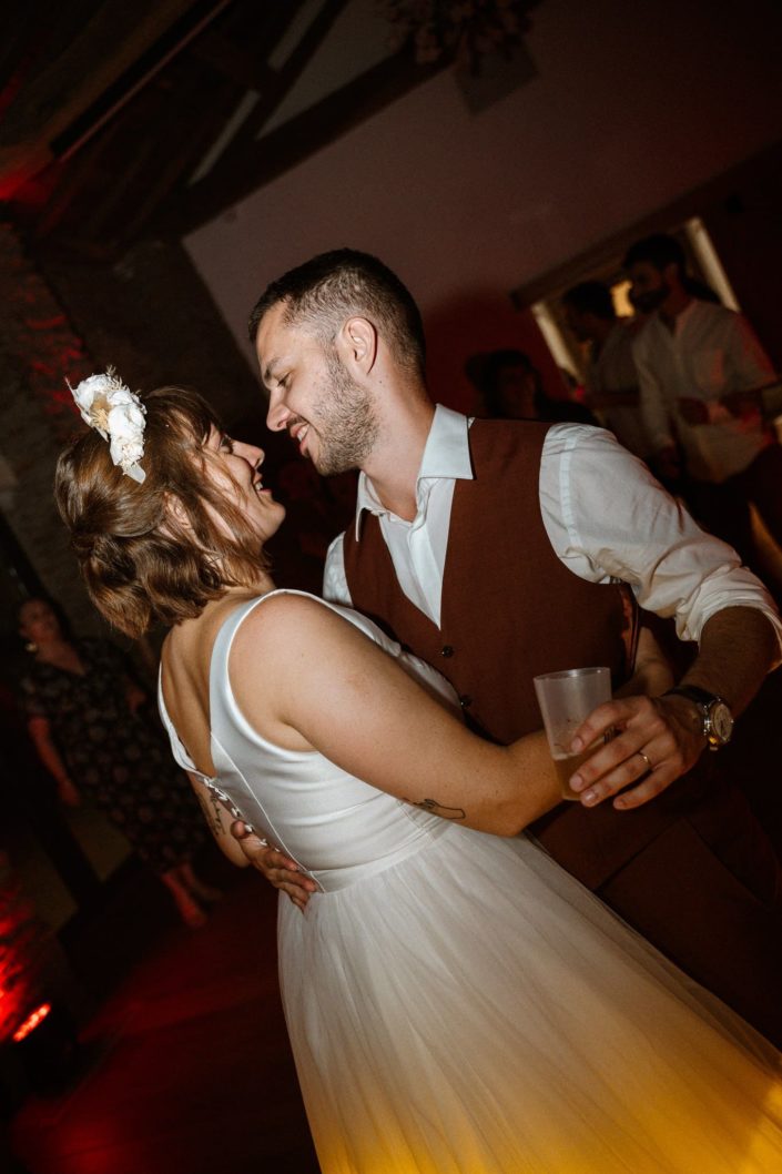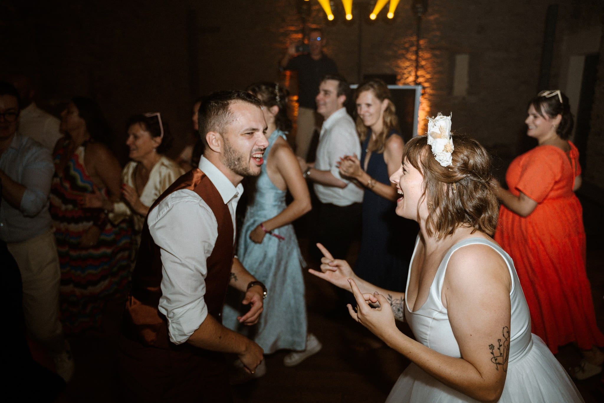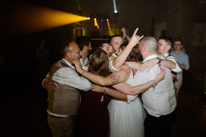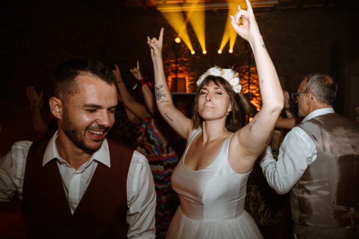 Vous connaissez les circle pit ? Et bien, nous avons découvert le concept le jour du mariage de Mathilde et Martin. Il s’agit d’une danse pendant un concert de rock où il faut tourner en rond tous ensemble sur un rythme rapide et assez musclé. Mathilde et Martin voulaient absolument apporter à leur mariage cette touche Hellfest qui les représente si bien, mais qui représente aussi l’ensemble des invités. Chaque année, ils se retrouvent tous au festival pour partager un week-end de folie. On vous laisse imaginer la playlist de la soirée dansante. C’était notre premier mariage rock n’roll et on en redemande. Martin nous a même fait une dédicace en passant Green Day, un groupe que l’on adore !
