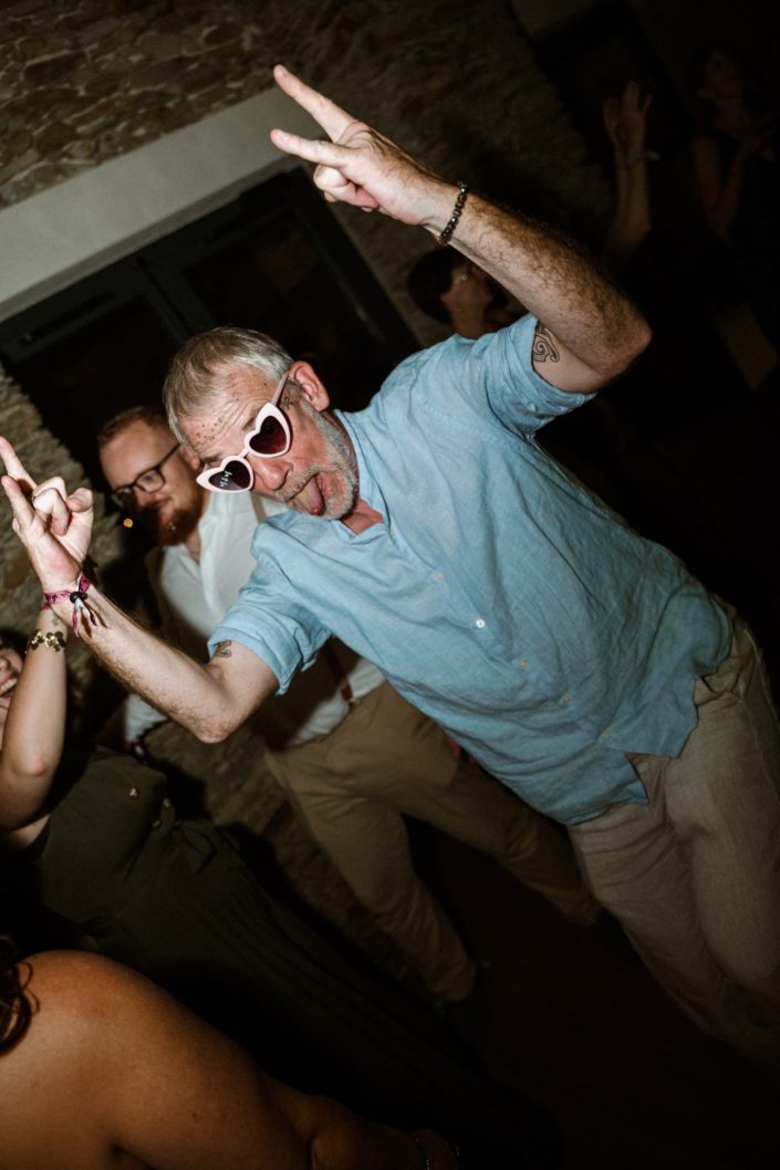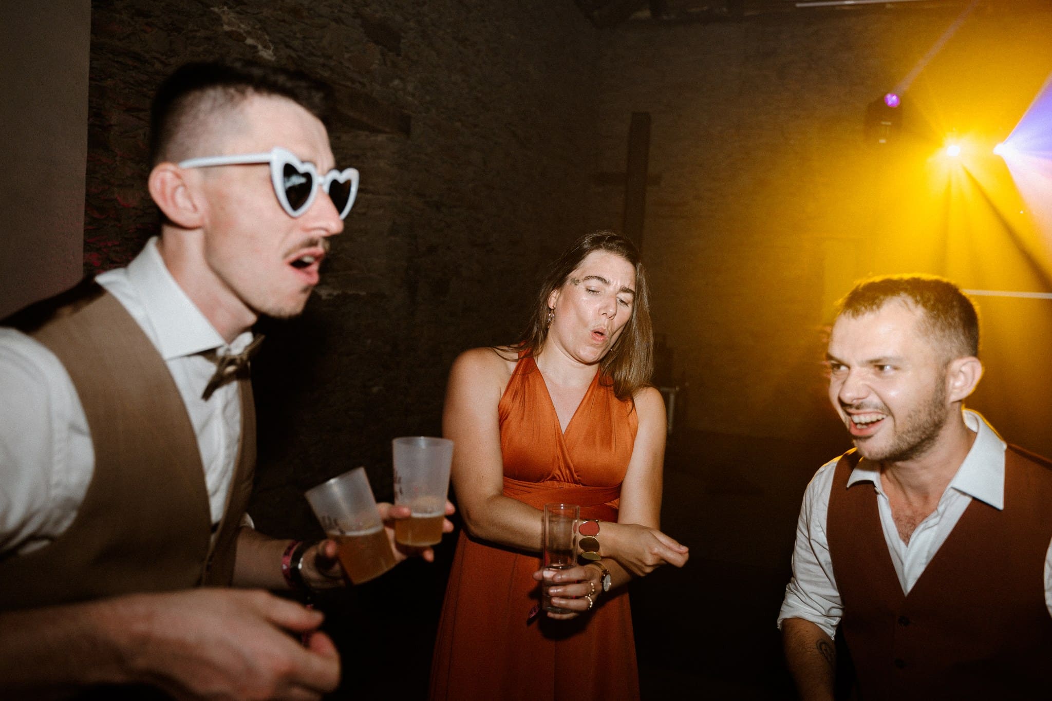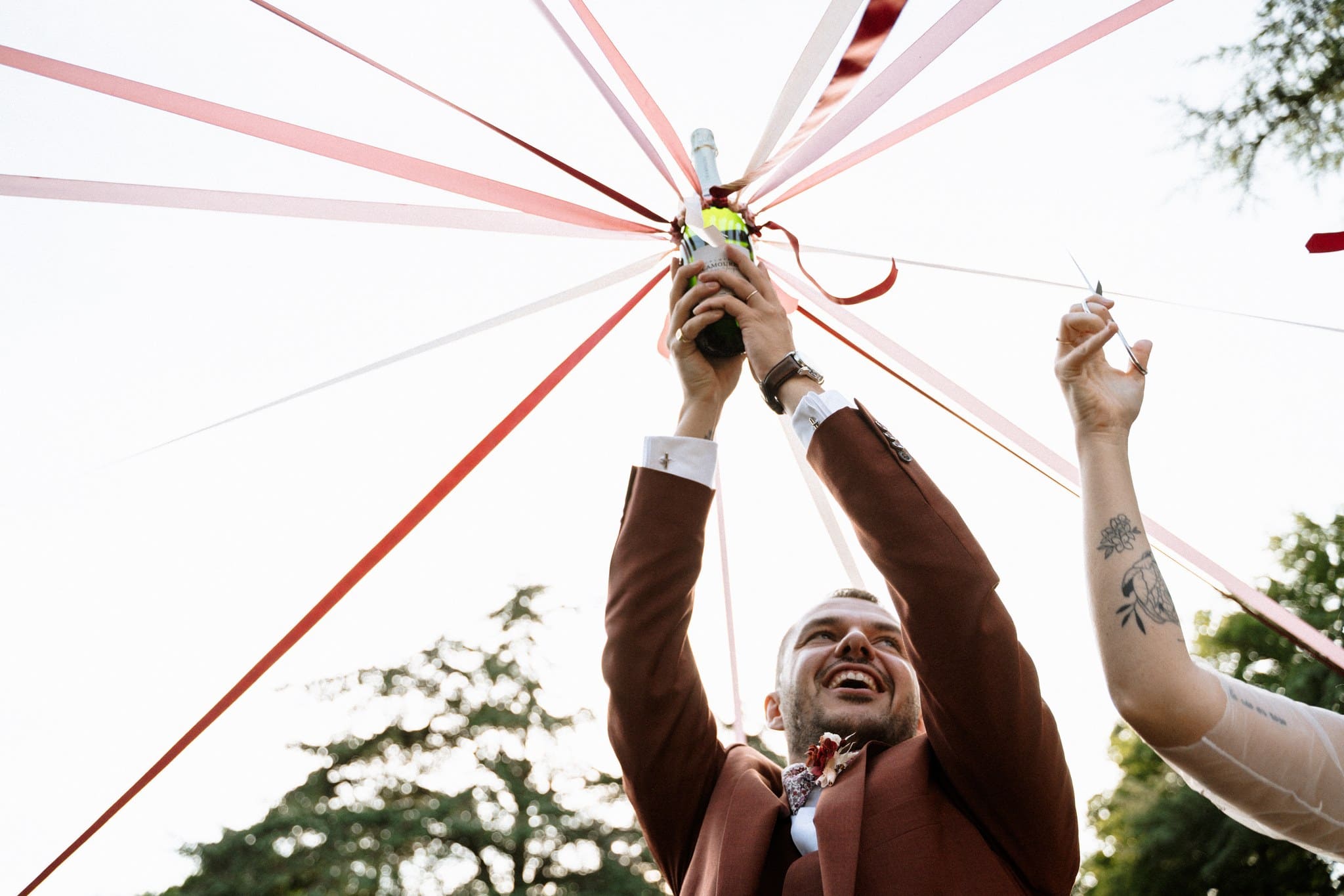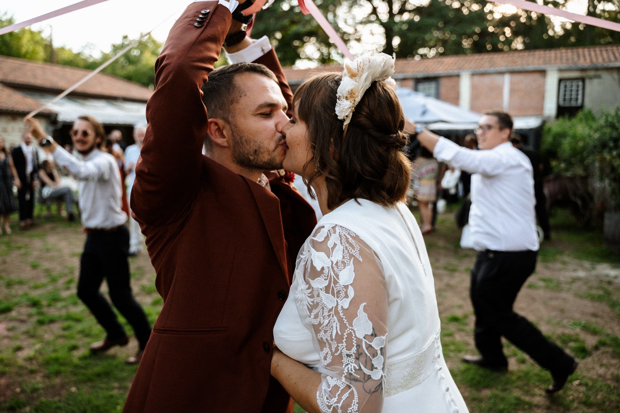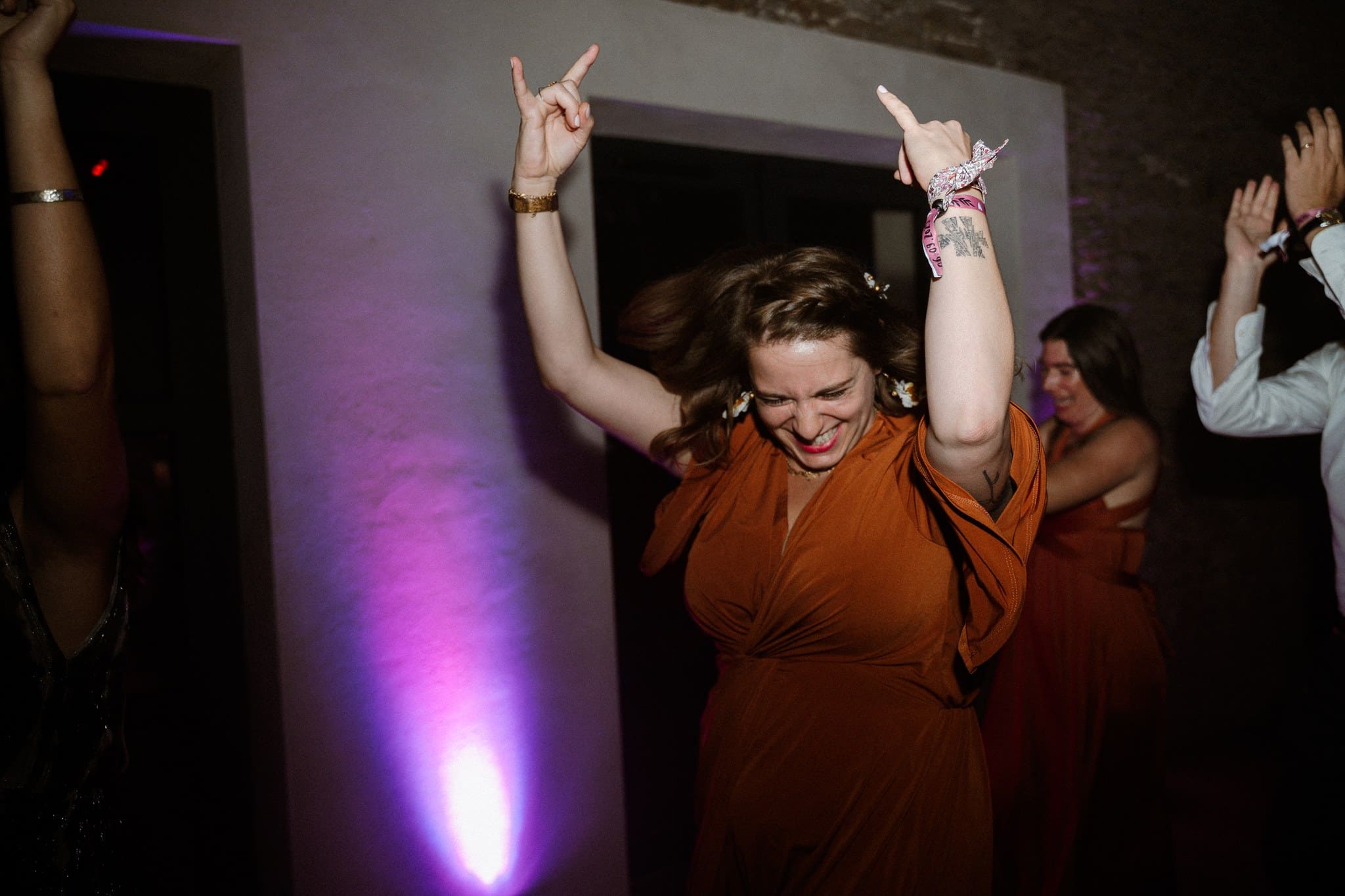 Vous connaissez les circle pit ? Et bien, nous avons découvert le concept le jour du mariage de Mathilde et Martin. Il s’agit d’une danse pendant un concert de rock où il faut tourner en rond tous ensemble sur un rythme rapide et assez musclé. Mathilde et Martin voulaient absolument apporter à leur mariage cette touche Hellfest qui les représente si bien, mais qui représente aussi l’ensemble des invités. Chaque année, ils se retrouvent tous au festival pour partager un week-end de folie. On vous laisse imaginer la playlist de la soirée dansante. C’était notre premier mariage rock n’roll et on en redemande. Martin nous a même fait une dédicace en passant Green Day, un groupe que l’on adore !